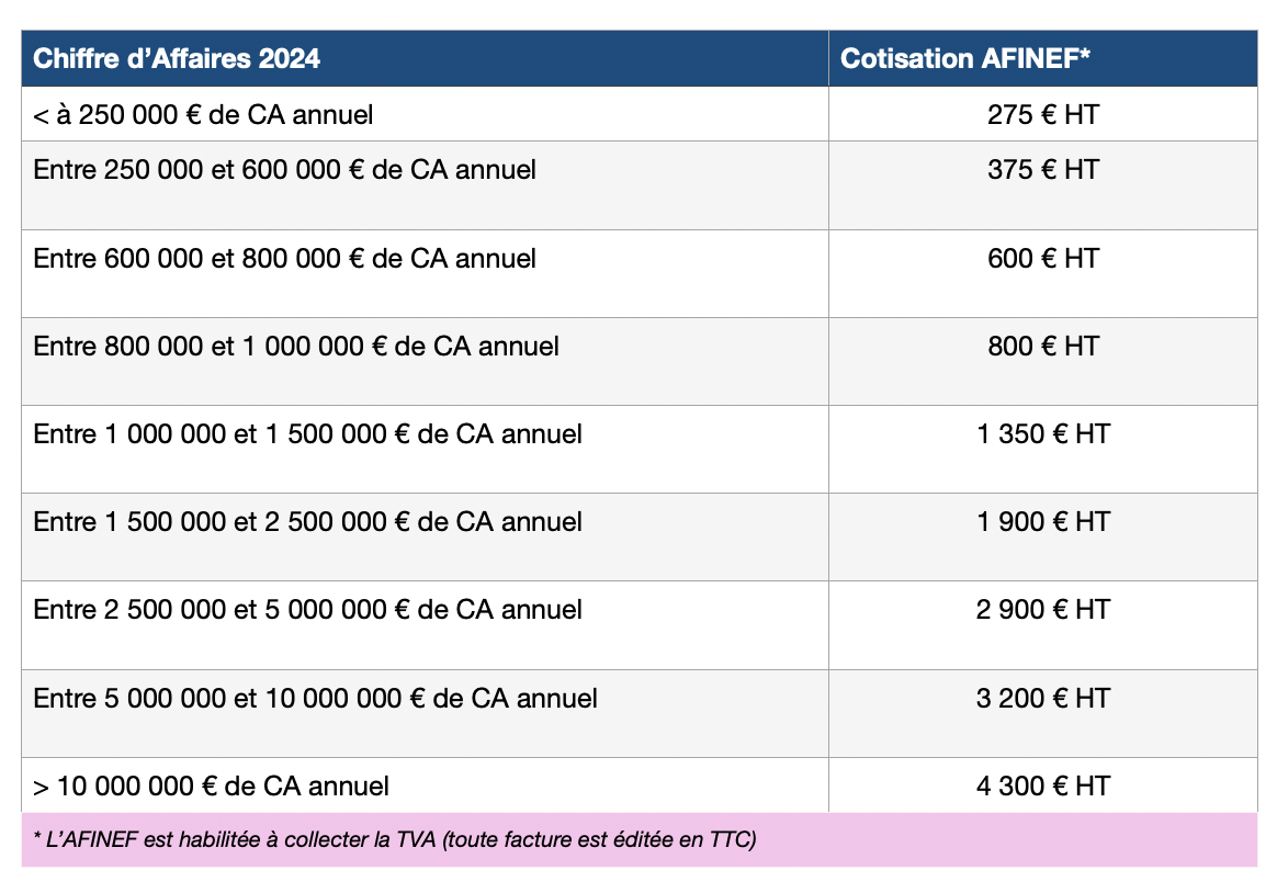 Grille de cotisations d’une adhésion en fonction du chiffre d’affaires (CA) Grille de Cotisations 2025 AFINEF